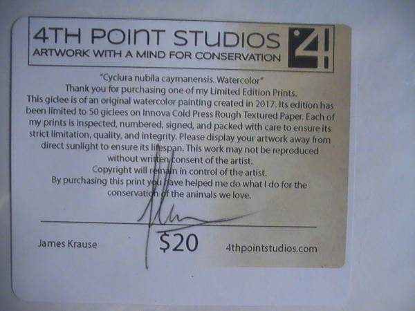 Limited edition James Krause print of Cyclura nubile caymanensis. Signed and numbered (#13/50), this 8” x 10” print is sealed in plastic with a cardboard support. $30.00
