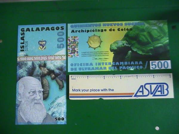 New, never circulated Galapagos 500 sucres note showing Galapagos tortoise for $3.00 Package of 15 for $30.00