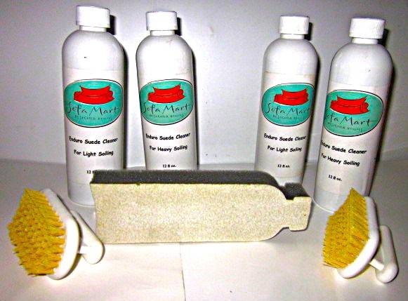 CLEANING and CARE KIT for SUEDE FURNITURE: Four 12-ounce Bottles of Suede Cleaner (2-light soiled & 2-heavy soiled). A two-sided Stain Blotting and Lifting Foam Sponge is included. 2-Cleaning Brushes for light scrubbing AND re-lifting the nap, after clean-and-dry. Instructions on each bottle. ONLY TWO of the bottles were lightly use, yet 80% remaining. Other two bottles unused.
